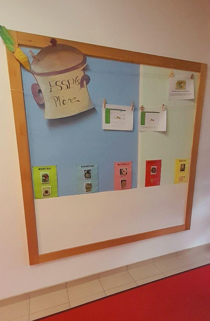 Dafür haben wir die Infowand zu den Essensplänen im Eingangsbereich neu gestaltet. Durch die verschieden farblich gekennzeichneten Wochentage und durch Fotos unser bekannten Mahlzeiten, können die Kinder nun selbst sehen, welches Essen oder vielleicht sogar die Lieblingsspeise es an diesem Tag gibt.