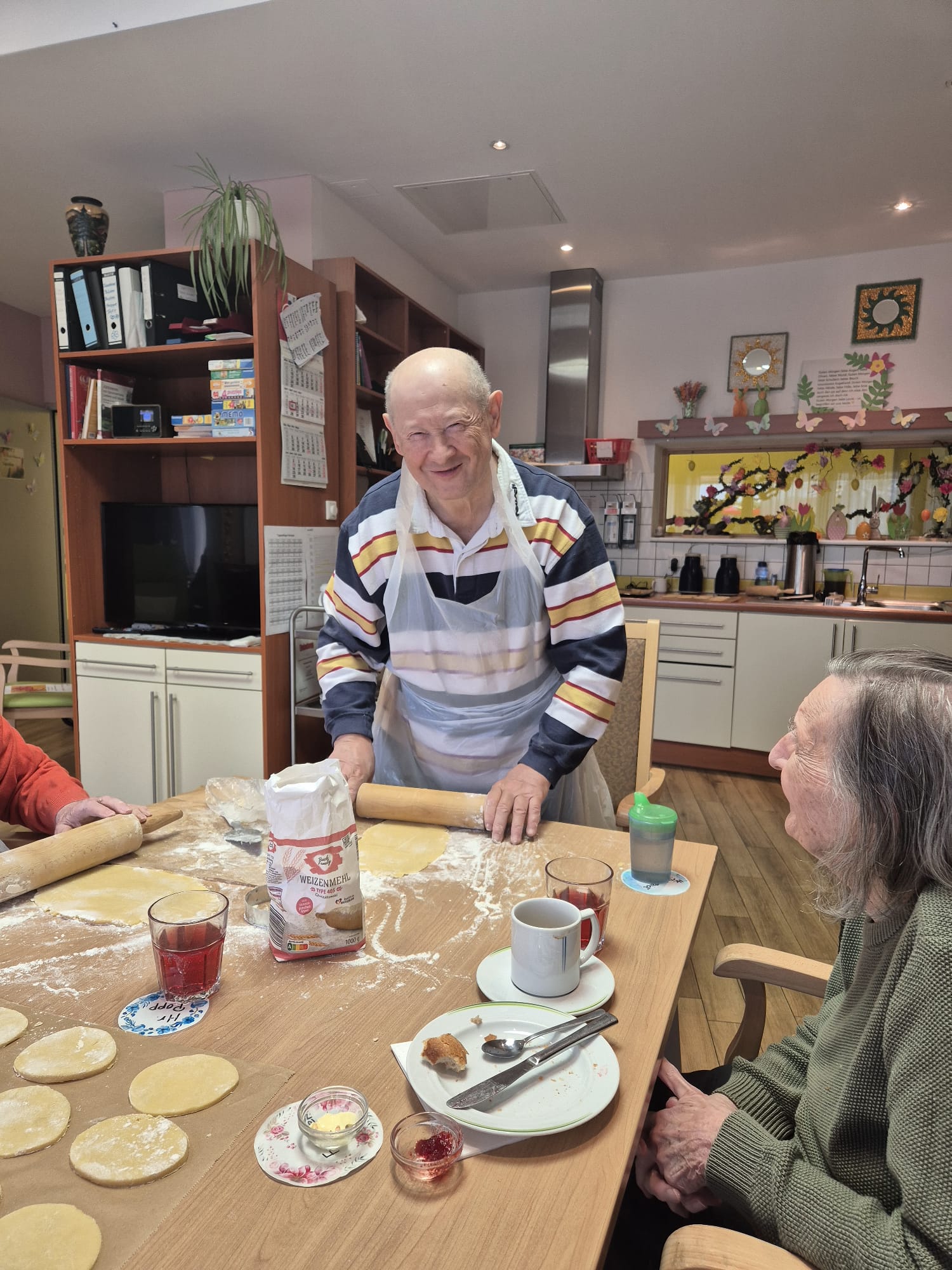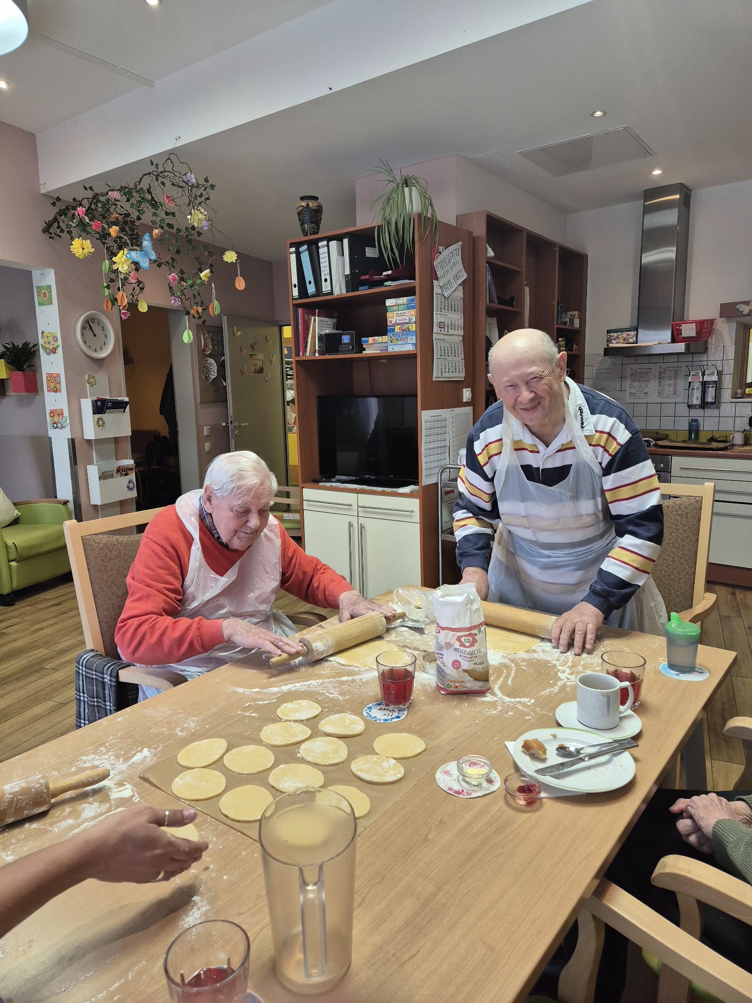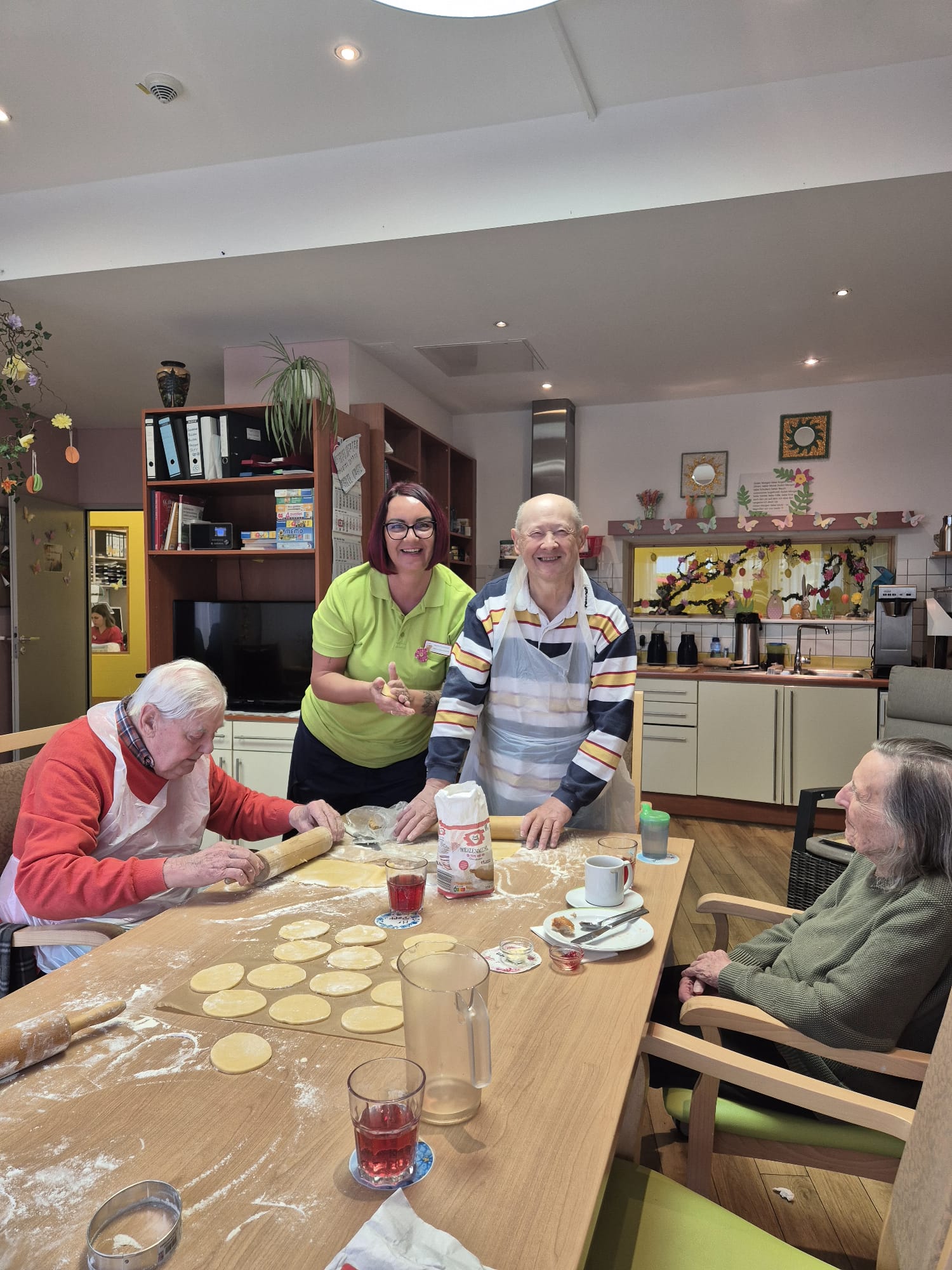 Doch es ging nicht nur ums Backen. Es wurde gelacht, gesungen und in Erinnerungen geschwelgt: “So haben wir früher zu Hause auch immer Osterkekse gemacht”, während liebevoll kleine Ostereier aus dem Teig ausgestochen wurden. Solche Momente des Austauschs und der Gemeinsamkeit machen das Leben in der Tagespflege besonders wertvoll.
